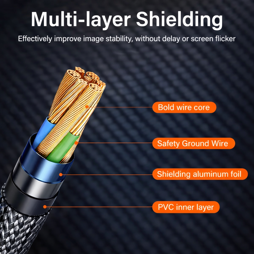 The internal structure features multi-layer shielding, including bold wire cores, safety ground wire, aluminum foil shielding, and a durable PVC inner layer. This design improves image stability and reduces interference, ensuring a clear picture without delay or screen flicker.