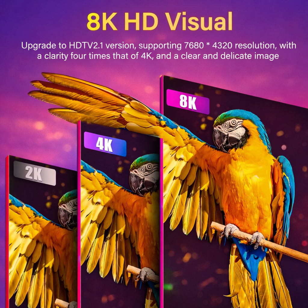 This HDMI 2.1 cable supports 8K Ultra HD resolution up to 7680 × 4320, delivering four times the clarity of 4K. Enjoy sharp details, vibrant colors, and lifelike images whether you are watching movies, streaming content, or gaming.