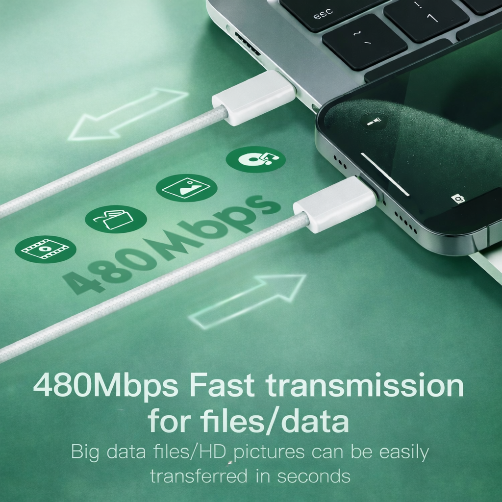Provides data transmission speeds of up to 480 Mbps, allowing fast transfer of large files, HD photos, videos, and documents. -